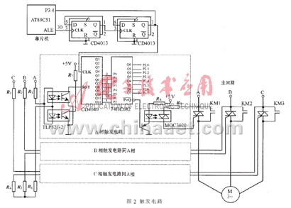 觸發(fā)角的計算:令計1個數(shù)的時間為t1,則t1=16/(250×103)s,設(shè)觸發(fā)角α占1個周期內(nèi)的時間段為t,則該觸發(fā)角對應(yīng)單片機P2口的十進制數(shù)γ=t/t1。將γ傳送至單片機P2口,則可控制雙向晶閘管在電源電壓的正、負(fù)半波對應(yīng)α角時被觸發(fā)導(dǎo)通。B、C二相晶閘管的觸發(fā)原理同A相。