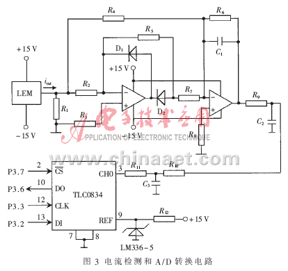 軟起動的主要任務(wù)是控制主電路的電流,因此要對電流進行檢測和監(jiān)控。電流檢測和A/D轉(zhuǎn)換電路如圖3所示。本裝置采用LEM電流傳感器進行主回路電流的檢測,其主要優(yōu)點是LEM電流傳感器可以測量任意波形的電流及瞬態(tài)峰值,副邊電流能真實地反映原邊電流的波形,原邊電路與副邊電路之間完全絕緣,可靠性高,而且動態(tài)性能好,精度高,因此能夠很好地滿足工業(yè)現(xiàn)場應(yīng)用的需要。為減小誤差保證轉(zhuǎn)換精度,沒有采用傳統(tǒng)的橋式二極管整流電路對LEM模塊輸出的電流進行整流,而是采用由2個運放組成的精密全波整流電路進行整流并濾波,得到與交流電流成比例變化的0~5V的直流電壓信號送入A/D轉(zhuǎn)換器TLC0834轉(zhuǎn)換成二進制數(shù)送入單片機,以此信號作為改變晶閘管觸發(fā)角大小的依據(jù),并用于數(shù)碼管顯示。TLC0834是8位串行控制模數(shù)轉(zhuǎn)換器,以5V作為基準(zhǔn)電壓,通過與控制處理器相連的串行數(shù)據(jù)鏈路傳送控制命令,用軟件對通道選擇和輸入端進行配置。多路器尋址通過TLC0834的DI端移入轉(zhuǎn)換器。TLC0834的DI、CLK、DO和/CS分別與單片機的P3.2、P3.3、P3.6和P3.7端口連接。程序中置/CS為低,使TLC0834能夠工作,并對轉(zhuǎn)換器初始化;然后從處理器接收1個時鐘,在每個時鐘的上升跳變時,DI端的數(shù)據(jù)移入多路器地址移位寄存器。在轉(zhuǎn)換過程中,轉(zhuǎn)換數(shù)據(jù)同時從DO端輸出。這樣TLC0834將輸入電壓轉(zhuǎn)換成二進制數(shù)送入單片機后進行處理和顯示。