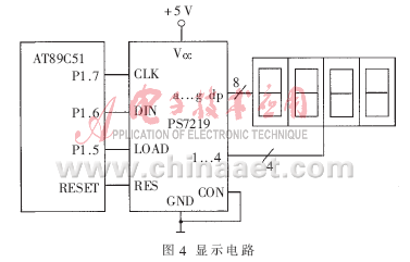 顯示電路如圖4所示,由高性能的多位LED顯示驅(qū)動器PS7219控制。PS7219內(nèi)部具有15×8BRAM功能控制器寄存器,尋址方便;其復(fù)位引腳與單片機的復(fù)位端連接,LOAD、DIN和CLK端分別與單片機的P1.5、P1.6和P1.7端口連接。LOAD腳的功能是裝載數(shù)據(jù)輸入,當(dāng)它為高電平時,串行輸入數(shù)據(jù)的最后16位被鎖定。串行數(shù)據(jù)的傳送格式為D15~D0,其中D15~D12為無關(guān)位,D11~D8為寄存器地址,D7~D0為數(shù)據(jù)位;DIN腳的功能是串行數(shù)據(jù)輸入,發(fā)送到DIN端的16位數(shù)據(jù)在每個CLK的下降沿被移入到內(nèi)部16位寄存器中;然后,在LOAD的上升沿,數(shù)據(jù)被鎖存到數(shù)值或控制寄存器中。