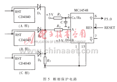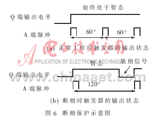 斷相是對電動機危害較大的一種故障,為此系統(tǒng)單獨設(shè)置了如圖5所示的斷相保護電路,主要由摩托羅拉單穩(wěn)態(tài)觸發(fā)器MC14548和3只二極管組成的“或門”電路實現(xiàn)。斷相保護示意圖如圖6所示。MC14548由上升沿觸發(fā),產(chǎn)生1個脈寬由外加定時元件電阻R1和電容C決定的輸出脈沖。當(dāng)MC14548的A端出現(xiàn)1個上升沿、B端為高電平時,Q端(平時輸出低電平)輸出1個由低到高的脈沖,經(jīng)過時間τ(τ=R1×C)后從高變低。分別來自A、B、C相觸發(fā)電路中計數(shù)器CD4040的RST端的3個信號經(jīng)“或門”電路與MC14548的A端相連。因三相電源電壓相位互差120°,故接入A、B、C三相回路的3個雙光耦TLP521每60°就有1次過零,過零時3個計數(shù)器CD4040的RST端一定有1個呈高電平,經(jīng)過“或門”后MC14548的4腳每60°就有1個上升沿脈沖。若設(shè)定時間常數(shù)τ的值在大于60°而小于120°所對應(yīng)的時間為:3.3ms<τ<6.6ms,則不缺相時,單穩(wěn)態(tài)觸發(fā)器將始終處于暫態(tài),MC14548的Q端始終輸出高電平,此時觸發(fā)器的工作狀態(tài)如圖6(a)所示;若斷相,MC14548的A端將出現(xiàn)隔120°才出現(xiàn)下一個脈沖的情況,此時MC14548的Q端將從暫態(tài)回到穩(wěn)態(tài),呈現(xiàn)低電平,此時觸發(fā)器的工作狀態(tài)如圖6(b)所示。將MC14548的Q端連至單片機的P3.0端口,由程序檢查P3.0端口,如為零則說明斷相,然后進行斷相處理。