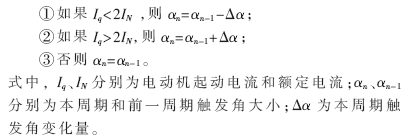 (3)軟起動模塊:根據(jù)電動機電流檢測信號,經(jīng)單片機分析和處理后得到當(dāng)前晶閘管觸發(fā)角的大小,以實現(xiàn)電機的限流起動。以起動電流限定為2倍的額定電流為例,觸發(fā)角控制算法如下: