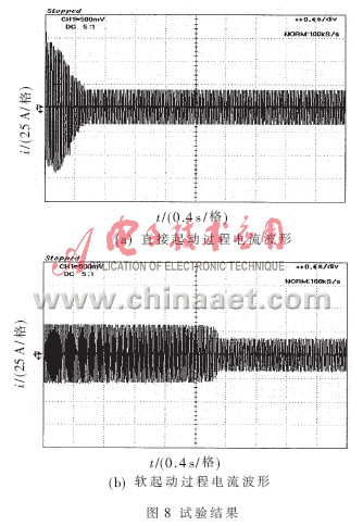 圖8為電機起動過程實測電流波形,圖8(a)為直接起動過程電流波形,圖8(b)為軟起動過程電流波形。可見整個軟起動過程中電流的變化很平穩(wěn),沒有出現(xiàn)振蕩現(xiàn)象,電機軟起動時的起動電流是其穩(wěn)定運行電流的2倍左右,而直接起動非常迅速,啟動電流很大,直接起動時的起動電流是其穩(wěn)定運行電流的5~7倍。試驗結(jié)果表明,所設(shè)計的軟起動器系統(tǒng)效果良好,起動過程平穩(wěn),無沖擊和振蕩。