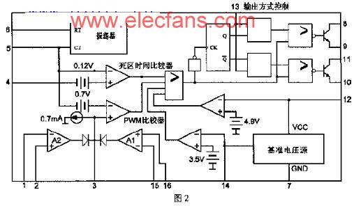 死區(qū)時間由4腳電壓來設(shè)定,范圍為0~3.3V之間。誤差放大器A1作為輸出電壓取樣誤差放大,結(jié)果通過PWM比較器控制脈寬使輸出電壓穩(wěn)定。誤差放大器A2作為保護(hù)控制用,15腳接參考電壓5V(由14腳提供),16腳為控制輸入。在開機保護(hù)、過溫或過流保護(hù)時,16腳為高電平,這時,誤差放大器A2輸出高電平,該電平高于振蕩器三角波電平幅值,而使驅(qū)動器沒有驅(qū)動脈沖輸出,負(fù)載安全停電。