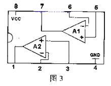 安全保護(hù)電路由KIA358電路來完成。出現(xiàn)異常情況時向TL494的16腳提供高電平。KIA358為雙運放電路(如圖3)。