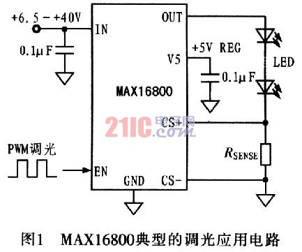 圖1為MAXl6800典型的調(diào)光應用電路。MAXl6800具有高輸入電壓范圍(達40V),可直接連接到汽車電池而不需要保護器件,保護器件一般用來抵御電池負載變化帶來的浪涌電壓。MAxl6800能夠為LED提供恒定電流,電流值可以通過與LED串聯(lián)的檢流電阻RSENSE設置。為了提高電流設置精度,提高對外部噪聲的抑制能力,MAXl6800采用差分電流檢測輸入方式。