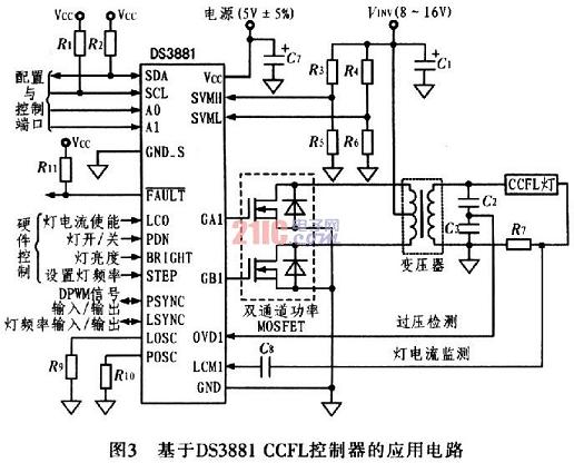 由于基本的CCFL電路中包含有外部晶體管、變壓器和燈管,CCFL架構(gòu)存在EMI輻射源。圖3給出利用DS388lCCFL控制器構(gòu)建的CCFL燈管電源電路,該設計優(yōu)化于汽車應用環(huán)境。DS388l利用擴展頻譜和頻率偏移技術大大降低了EMI輻射,并把噪聲頻譜搬移到系統(tǒng)不敏感的頻段,從而克服了EMI輻射。