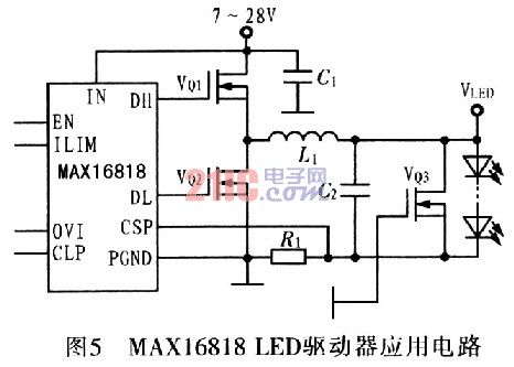 需要較高照明功率的場合,如泛光燈或霧燈,必須使用超高亮度LED(HBLED)。HBLED需要較高的驅(qū)動電流,前面討論的產(chǎn)品無法提供低成本設計,需要過多的驅(qū)動器產(chǎn)生所需的電流。最好采用能驅(qū)動大電流功率管的控制器,大電流功率管可以為HBLED提供高達30A的電流,MAXl6818可以滿足這種設計要求,如圖5所示。