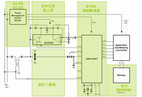 此外,AMIS-49587采用S-FSK調制技術,結合高分辨率的濾波算法,配以自動可信值/中繼器(repeater)功能,提供基于長距離電力線的高可靠性數據通信。通信誤差比其它可選及現有方案更低。這器件藉板載低抖動鎖相環(PLL)與交流主電源(mains)信號同步。由于包含16位分辨率的模擬前端,使器件具有極優的噪聲免疫性和極高的接收靈敏度。