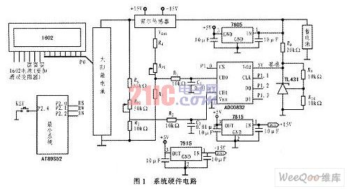 單片機(jī)正常運(yùn)行需要為片內(nèi)的晶體管或場(chǎng)效應(yīng)管供給電源,使其工作在相應(yīng)狀態(tài)。AT89S52需要一個(gè)5V電源(實(shí)際工作電壓為3.6~6.0V)。可用整流、穩(wěn)壓方式供電,獲得4.5V左右的電壓,因本系統(tǒng)為獨(dú)立發(fā)電,且長(zhǎng)期使用,考慮到電源壽命,該裝置由市電或干電池提供驅(qū)動(dòng)電源不符合實(shí)際,所以最佳方案應(yīng)該由系統(tǒng)內(nèi)部太陽(yáng)能電池的蓄電池供電,經(jīng)穩(wěn)壓集成塊7805穩(wěn)壓為5V,輸入單片機(jī)Vcc引腳,驅(qū)動(dòng)單片機(jī)及液晶顯示裝置。TBCl0SY霍爾電流傳感器,需±15V雙電源供電,同樣采用系統(tǒng)內(nèi)的蓄電池供電.經(jīng)穩(wěn)壓集成塊7805、7915穩(wěn)壓在±15V,從而驅(qū)動(dòng)其工作。