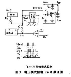 改善加快電壓模式控制瞬態響應速度的方法有二種:一是增加電壓誤差放大器的帶寬,保證具有一定的高頻增益。但是這樣容易受高頻開關噪聲干擾影響,需要在主電路及反饋控制電路上采取措施進行抑制或同相位衰減平滑處理;另一方法是采用電壓前饋模式控制PWM技術,原理如圖3(b)所示。用輸入電壓對電阻電容(RFF、CFF)充電產生的具有可變化上斜坡的三角波取代傳統電壓模式控制PWM中振蕩器產生的固定三角波。此時輸入電壓變化能立刻在脈沖寬度的變化上反映出來,因此該方法對輸入電壓的變化引起的瞬態響應速度明顯提高。對輸入電壓的前饋控制是開環控制,而對輸出電壓的控制是閉環控制,目的是增加對輸入電壓變化的動態響應速度。這是一個有開環和閉環構成的雙環控制系統。
