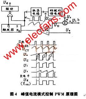 峰值電流模式控制簡稱電流模式控制。它的概念在60年代后期來源于具有原邊電流保護功能的單端自激式反激開關電源。在70年代后期才從學術上作深入地建模研究。直至80年代初期,第一批電流模式控制PWM集成電路(UC3842、UC3846)的出現使得電流模式控制迅速推廣應用,主要用于單端及推挽電路。近年來,由于大占空比時所必需的同步不失真斜坡補償技術實現上的難度及抗噪聲性能差,電流模式控制面臨著改善性能后的電壓模式控制的挑戰。如圖4所示,誤差電壓信號Ue送至PWM比較器后,并不是象電壓模式那樣與振蕩電路產生的固定三角波狀電壓斜坡比較,而是與一個變化的其峰值代表輸出電感電流峰值的三角狀波形或梯形尖角狀合成波形信號UΣ比較,然后得到PWM脈沖關斷時刻。因此(峰值)電流模式控制不是用電壓誤差信號直接控制PWM脈沖寬度,而是直接控制峰值輸出側的電感電流大小,然后間接地控制PWM脈沖寬度。