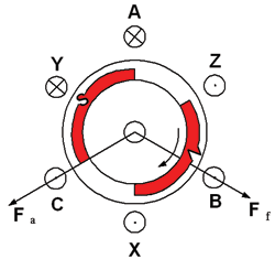 得知Hall輸出信號(hào)與轉(zhuǎn)子磁動(dòng)勢(shì)位置的關(guān)系之后,可以產(chǎn)生正六邊形的旋轉(zhuǎn)磁場,如圖4所示,AB相繞組通電,產(chǎn)生圖中合成磁勢(shì)Fa,由于Fa的牽引,F(xiàn)f將會(huì)順時(shí)針旋轉(zhuǎn),旋轉(zhuǎn)到X位置后,換成給AC相通電,則Fa順時(shí)針跳躍60°電角度,牽引Ff順時(shí)針旋轉(zhuǎn)60°,依次類推,通電順序按照AB-AC-BC-BA-CA-CB-AB循環(huán),則帶動(dòng)永磁轉(zhuǎn)子順時(shí)針旋轉(zhuǎn)。這就是傳統(tǒng)的方波控制方式。