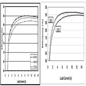 Maxim電源部制作了一款基于MAX5051的隔離電源模塊,圖2是詳細的電氣原理圖。我們將該電源模塊與市場上流行的電流模式同步整流推挽電源模塊(這里我們稱其為非定制模塊)進行了比較,從所測試的效率曲線(圖3)可以看出,基于MAX5051的模塊效率明顯提高。輕載時,比如1A輸出負載,MAX5051模塊電源的效率大于62%,而非定制模塊的效率則小于58%。在輸出功率為半載時(7.5A),MAX5051模塊效率為92%,非定制模塊效率是88%。滿功率負載時,MAX5051模塊電源的效率仍比非定制模塊效率高出4%。從效率曲線對比,可以得出雙管正激電路能夠更好的滿足模塊電源高效率的要求。