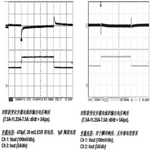 從動態響應的圖形對比中可以看到,無論是輸出過沖,還是恢復時間,MAX5051模塊都具有明顯的優勢。