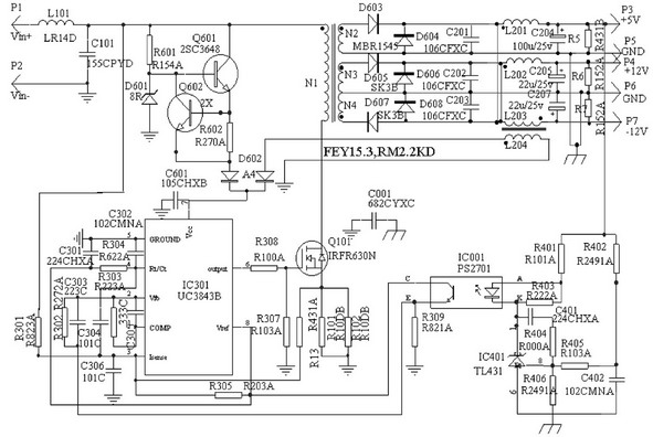 電源工作原理為:電路采用單端正激變換電路,當變換器接通電源時,輸入直流電壓經由電阻、12V穩(wěn)壓管D601和三極管Q601、Q602組成的電路穩(wěn)壓降壓后, 啟動UC3843進入正常工作,偏置繞組L204的供電電路開始工作,輸出經A4和C601整流及濾波后輸出12V電壓,高于自供電電壓,使二極管A4反偏,啟動電路停止工作。變換器進入正常工作后,電源依據PWM脈寬調制方式工作,次級繞組的輸出經過二極管整流以及電容器和電感器組成的LC型濾波器濾波后,產生所需的各路輸出直流電壓。+5V的輸出電壓由電阻器R402和R406分壓后,與可編程穩(wěn)壓源TL431(U3)中的2.5V參考電壓比較,然后通過光耦合器U2反饋到UC3843的2腳,控制脈沖的占空比,穩(wěn)定5V輸出。耦合電感L202和L203實現+/-12V兩路穩(wěn)壓。過流保護電阻R101、R102檢測到開關管的過流信號,送入3843的3腳,封鎖UC3843的輸出信號,實現過流保護。