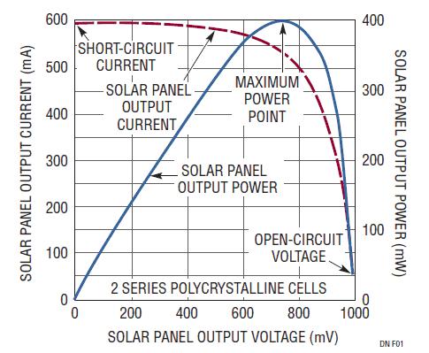 雖然太陽(yáng)能電池或太陽(yáng)能電池板是按照功率輸出來(lái)分類(lèi),但電池板的可用功率卻很少是恒定的。其輸出功率在很大程度上取決于光照、溫度以及從電池板吸收的負(fù)載電流。為說(shuō)明這一點(diǎn),圖 1 示出了一塊雙電池太陽(yáng)能板在恒定光照條件下的 V-I 特性曲線。I-V 曲線在短路 (最左側(cè)) 至大約 550mA 負(fù)載電流的范圍內(nèi)具有相對(duì)恒定的電流特性,隨之在較低的電流條件下它遵從于恒定電壓特性,并在開(kāi)路時(shí) (最右側(cè)) 趨近于最大電壓。電池板的功率輸出曲線顯示:功率輸出在大約 750mV/530mA 的地方 (I-V 曲線的拐點(diǎn)處) 出現(xiàn)一個(gè)明顯的峰值。如果負(fù)載電流增至超過(guò)功率峰值,則功率曲線迅速下降至零 (最左側(cè))。同樣,輕負(fù)載也會(huì)使功率趨向于零 (最右側(cè)),不過(guò)這往往不太會(huì)是一個(gè)問(wèn)題。