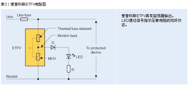 為使太陽能逆變器制造商以低成本滿足各大標(biāo)準(zhǔn)及保險公司的嚴(yán)格要求,TDK-EPC現(xiàn)開發(fā)出 ETFV系列(愛普科斯熱熔式壓敏電阻)。這些組件通過串聯(lián)電路組合在一起,包括一個壓敏電阻和一個熱熔絲。如果壓敏電阻已嚴(yán)重退化,并致使較高漏電流導(dǎo)致過熱,熔絲將熔斷以斷開壓敏電阻。上述元件的一大特色便是監(jiān)視引線:通過延伸壓敏電阻與熱熔絲之間的觸點以驅(qū)動LED(參見圖3)。