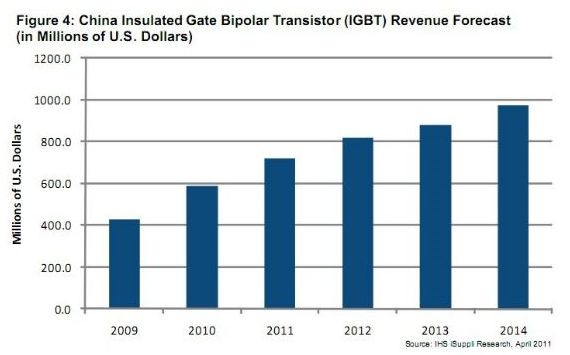 隨著中國高鐵、地鐵、動車、風(fēng)力發(fā)電、光伏發(fā)電、電動/混合動力汽車等領(lǐng)域的快速發(fā)展,市場對IGBT及其模塊的需求越來越大。據(jù)IHS iSuppli公司的研究,由于工業(yè)與消費領(lǐng)域的需求增長,中國絕緣柵雙極型晶體管(IGBT)市場未來幾年將快速增長,2014年銷售額將從2009年的4.297億美元上升到9.75億美元,增長一倍以上。