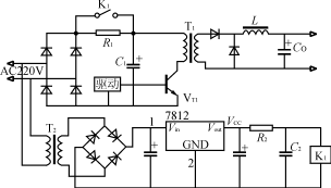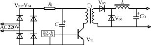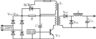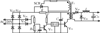 該電路如圖3所示。在電源瞬時(shí)接通時(shí),輸入電壓經(jīng)整流橋VD1VD4和限流電阻R對電容器C充電。當(dāng)電容器C充電到約80%的額定電壓時(shí),逆變器正常工作,經(jīng)主變壓器輔助繞組產(chǎn)生晶閘管的觸發(fā)信號(hào),使晶閘管導(dǎo)通并短路限流電阻R,開關(guān)電源處于正常運(yùn)行狀態(tài)。