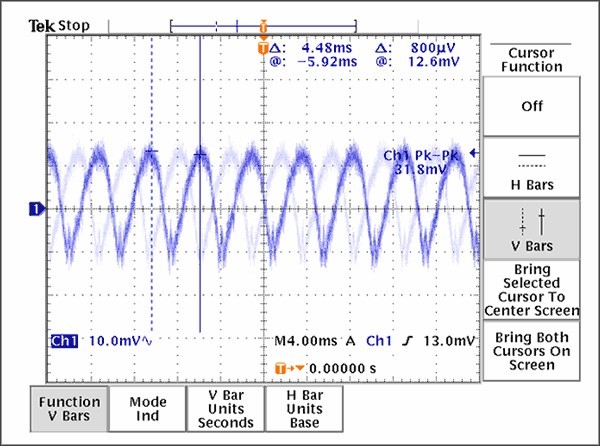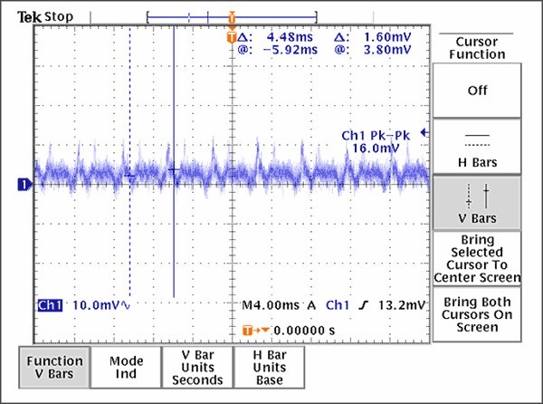 [page]經驗證明,抑制PLL雜散的有效途徑是合理的接地、電源布局和去耦技術,本文討論的布線原則是減小PLL雜散分量的良好設計開端??紤]到電荷泵中存在較大的電流變化,采用星形拓撲非常必要。如果沒有足夠的隔離,電流脈沖產生的噪聲會耦合到VCO電源,對VCO頻率進行調制,通常稱為“VCO牽引”。通過電源線間的物理間隔和每個VCC引腳的去耦電容、合理放置接地過孔、引入一個串聯的鐵氧體元件(作為最后一個手段)等措施可以提高隔離度。上述措施并不需要全部用在每個設計中,適當采用每種方式都會有效降低雜散幅度。圖9提供了一個由于不合理的VCO電源去耦方案所產生的結果,電源紋波表明正是電荷泵的開關效應導致電源線上的強干擾。值得慶幸的是,這種強干擾可以通過增加旁路電容得到有效抑制。圖10顯示的是在電路改變后,在同一點的測量結果。