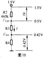 溫度傳感器采用NTC熱敏電阻RT,已知RT在0℃時阻值為333.1kΩ;5℃時阻值為258.3kΩ,則按1.5V工作電壓及流過R1、RT的電流約1.5 uA,可求出R1的值。R1的值確定后,可計(jì)算出0℃時的VA值為0.5V(按圖10中R1=665kΩ時),5℃時的VA值為0.42V,則VTHL=0.42V,VTHH=0.5V。若設(shè)R2=665kΩ,則按圖11,可求出流過R2、R3、R4電阻的電流I=(1.5V-0.5V)/665kΩ=0.0015mA,按R4×I/=0.42V,可求出R4=280kΩ再按0.5V=(R3+R4)0.0015mA, 則可求出R3=53.3kΩ。