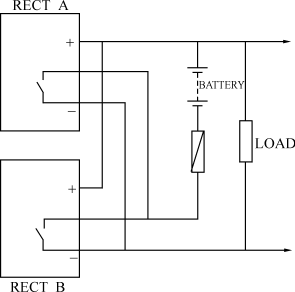 一個使電源系統(tǒng)簡化的新功能是整流器內(nèi)置低壓斷開裝置。這一功能會在市電斷電一段時間后電池電壓低于閾值時發(fā)揮作用,這就防止了電池的永久性損壞。如果是大量模塊并聯(lián)的系統(tǒng),在每個模塊內(nèi)置低壓斷開裝置很不實際;這時選用系統(tǒng)解決辦法更合適。在較小的系統(tǒng)即2個模塊并聯(lián)(1+1),每個模塊都內(nèi)置一個低壓斷開裝置很理想。這會使系統(tǒng)特別簡易,只有兩個整流器,一個電池和一個電池保險。圖3是系統(tǒng)框圖。