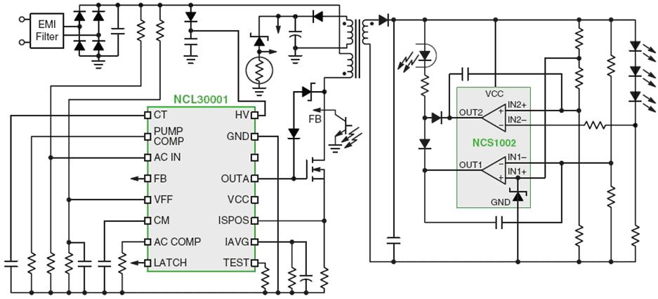 NCL30001是一種整體式/單段式的LED驅(qū)動(dòng)方案,這種方案集成了PFC和隔離型DC-DC轉(zhuǎn)換電路,并提供恒定電流來(lái)直接驅(qū)動(dòng)LED。這種方案相當(dāng)于將AC-DC轉(zhuǎn)換與LED驅(qū)動(dòng)兩部分電路整合在一起,均位于照明燈具內(nèi),省下了LED光條中集成的線(xiàn)性或DC-DC轉(zhuǎn)換器。這種整體式方案的電源轉(zhuǎn)換段更少,減少元器件使用數(shù)量(如光學(xué)元件、LED、電子元件及印制電路板等)、降低系統(tǒng)成本,并支持更高的LED電源總體能效。當(dāng)然,這種方案的功率密度更高,可能并不適合所有區(qū)域照明應(yīng)用,其光學(xué)圖案可能更適合較低功率的LED,典型應(yīng)用包括LED街燈、外墻燈、洗墻燈及電冰箱箱體照明等。