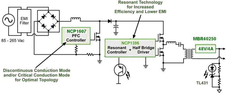 在這類(lèi)要求超高能效的更大功率LED區(qū)域照明應(yīng)用中,可以結(jié)合采用安森美半導(dǎo)體的NCP1607 PFC控制器和NCP1397雙電感加單電容(LLC)半橋諧振控制器,用于功率在50到300 W范圍的高能效LED街道照明應(yīng)用。NCP1397是最新高性能諧振模式LLC控制器,集成了600 V高壓浮動(dòng)驅(qū)動(dòng)器,支持50到500 kHz的高頻工作,內(nèi)置高端和低端驅(qū)動(dòng)器,支持可調(diào)節(jié)及精確的最低頻率,提供極高能效,并具備多種故障保護(hù)特性。