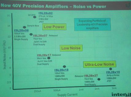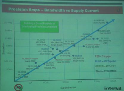 Intersil建立一個以精準放大器為主的大系列產(chǎn)品,從最初的ISL28194到ISL28190/290產(chǎn)品,頻帶寬度和電流都有很大提升。