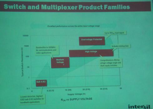 Roger還介紹了Intersil開關和多路復用器及接口產(chǎn)品線的情況,其sub 0.5Ω開關用于便攜應用,中壓產(chǎn)品用于通信和視頻應用,并且能提供高壓單/雙電源開關等。