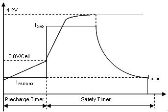 預充電安全定時器可避免長時間給電量耗盡的電池充電。一般說來,電池單元電壓達到 3.0 V,充電器就會進入 CC 階段。快速充電電流通常限定在 0.5 至 1C 之間,以避免過熱導致電池加速退化。應選擇適當的速度,確保電池溫度不超過 45oC,然后在快充速率下進行電池充電,直至電壓達到調節限度(對基于 LiCoO2 的陰極而言通常是每單元 4.2 V)。充電器開始調節電池電壓并進入 CV 階段,這時充電電流會呈指數地下降至預定終止水平,結束電池充電。
