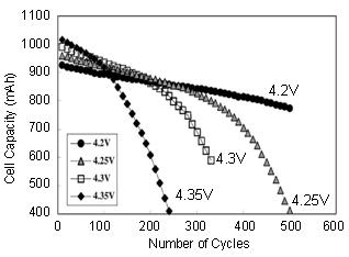 圖 4:LiCoO2 陰極鋰離子電池的充電電壓和使用壽命之間的關系