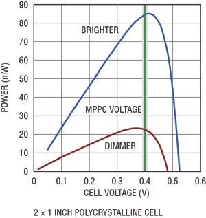 為了從光伏電池抽取最大功率,電源轉換器的輸入阻抗必須與電池的輸出阻抗匹配,從而使系統能在最大功率點上工作。圖3顯示了一個典型的單節光伏電池的功率曲線。為了確保抽取最大功率,光伏電池的輸出電壓應該與功率曲線的峰值點相對應。LTC3105 調節提供給負載的輸出電流,以保持光伏電池的電壓等于最大功率點控制引腳設定的電壓。因此可用單個電阻器設定最大功率點,并確保從光伏電池抽取最大功率和峰值輸出充電電流。