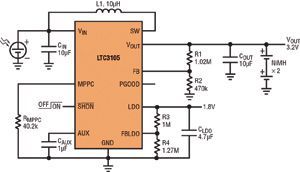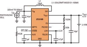 串聯連接的高壓光伏電池組能提供充足的功率,但單節光伏電池解決方案卻很少見,因為單節光伏電池在有負載情況下產生的電壓很低,從這么低的電壓難以產生有用的電源軌。幾乎沒有升壓型轉換器能從電壓很低、阻抗相對較高的單節光伏電池產生輸出。不過,LTC3105是專門為應對這類挑戰而設計。該器件具有超低的250mV啟動電壓和可編程最大功率點控制,能從富有挑戰性的光伏電源產生大多數應用所需的典型電壓軌(1.8~5V)。