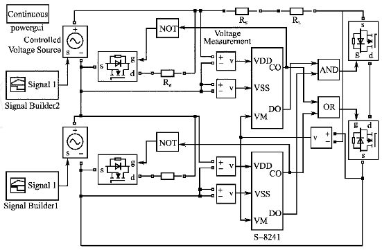 根據上述均衡充電保護板電路工作的基本原理,在Matlab/Simulink環境下搭建了系統仿真模型,模擬鋰電池組充放電過程中保護板工作的情況,驗證該設計方案的可行性。為簡單起見,給出了鋰電池組僅由2節鋰電池串聯的仿真模型,如圖5所示。