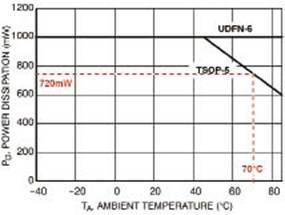 環境溫度低于70℃時,TSOP-5和µDFN-6封裝都可以耗散720mW的功率,因此能滿足這一應用的最壞情況要求。然而,µDFN-6封裝的功率耗散能力更強,與采用TSOP-5封裝的同等轉換器設計相比,能夠承受的溫度更高。