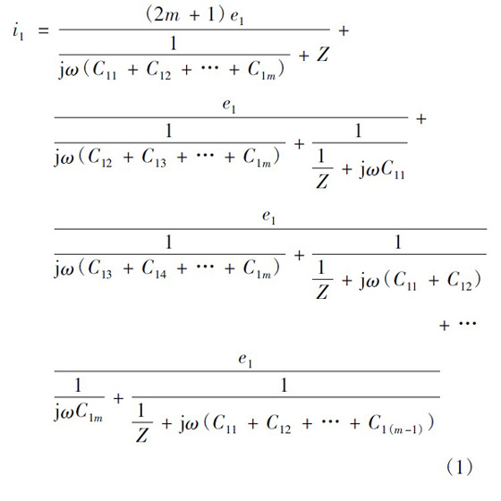 設(shè)一次繞組有3 層,每層m 匝,二次繞組僅一層,為n 匝。當(dāng)變壓器磁芯中的磁通發(fā)生變化,便會同時(shí)在一次側(cè)和次級產(chǎn)生感應(yīng)電動勢。根據(jù)疊加定理,可認(rèn)為這是僅一次繞組有感應(yīng)電動勢、二次繞組電動勢為零和僅二次繞組有感應(yīng)電動勢、一次繞組電動勢為零兩種情況的疊加。僅一次繞組有感應(yīng)電動勢、二次繞組電動勢為零的情況如圖5 所示。圖5 中:e1為每匝一次繞組的感應(yīng)電動勢;C1x為一匝最外層一次繞組與二次繞組間的寄生電容。