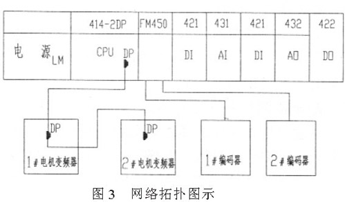采用PLC 與變頻器控制方法, 實現多個分散驅動電機同步運行。PLC 采用西門子S7400 系列, 圖3為網絡拓撲圖。