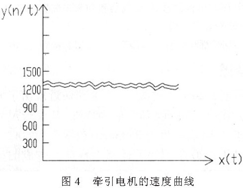 利用 STEP7 編制PLC 上位機監控程序,Wincc采集速度值并繪制曲線。數據提取的時間間隔為15ms。實際上牽引電機1 和牽引電機2 速度是相同的, 但為了反映牽引電機2 的跟蹤和波動情況, 在此特地將其分開, 上面是牽引電機1 的速度曲線, 下面是牽引電機2 的速度曲線(見圖4) 。牽引電機1 的速度發生變化時, 牽引電機2 就能及時地響應, 進行跟蹤, 并且能很快地達到穩定。實驗表明, 采用PLC 和變頻器的控制方法, 能達到較高的同步要求, 響應快、速度波動幅度較小。