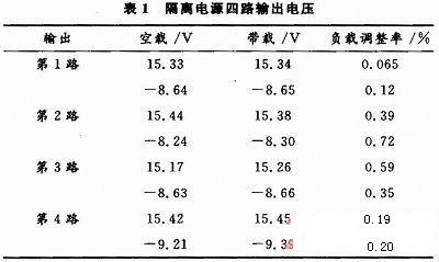 對設計的電路進行實驗,得出了實驗數據和波形。表1為隔離電源在空載和帶載(+15 V,-9 V/0.2 A一路輸出帶載240 Ω,另外3路輸出各帶載120 Ω)下的4路輸出電壓值及相應的負載調整率。