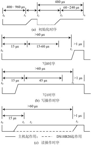 (1)初始化時序。時序見圖2(a),主機(jī)總線t0時刻發(fā)送一復(fù)位脈沖(最短為480s的低電平信號)接著在t1時刻釋放總線并進(jìn)入接收狀態(tài),DS18B20在檢測到總線的上升沿之后等待15~60μs,接著DS18B20在t2時刻發(fā)出存在脈沖(低電平持續(xù)60~240s),如圖中虛線所示。