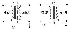 圖4 1∶1隔離變壓器屏蔽及接地方式圖 a. 單屏蔽層 b.雙屏蔽層