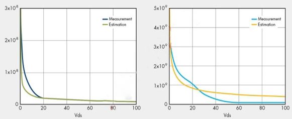 圖2(a)顯示了輸出電容的測量值及由公式(3)得出的擬合曲線。然而,對于具有更多非線性特性的新式超級結(jié)MOSFET而言,則簡單的指數(shù)曲線擬合有時不夠好。圖2(b)顯示了最新技術MOSFET的輸出電容測量值及用公式(3)得出的擬合曲線。兩者在高壓區(qū)的差距將導致等效輸出電容的巨大差異,因為在積分公式中電壓與電容是相乘的。圖2(b)中的估計將得出大得多的等效電容,這會誤導轉(zhuǎn)換器的初始設計。