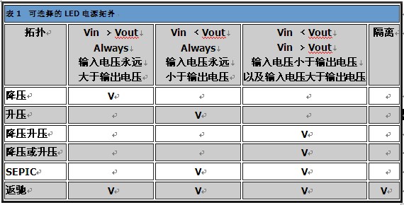 表1的信息可供作選擇LED驅動器最佳切換拓撲的參考。除了這些拓撲之外,也可以使用簡單的電流限制電阻或是線性穩壓器,不過這些方法通常會耗用過多功率。輸入電壓范圍、驅動的LED數目、LED電流、隔離、電磁干擾(EMI)限制以及效能,都是相關的設計參數。大部分的LED驅動電路可分為以下幾種拓撲類別:降壓、升壓、降壓升壓、SEPIC以及返馳。