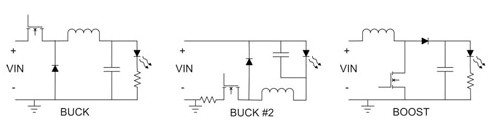 圖1也顯示替代的降壓穩壓器(Buck #2)。在此電路中,MOSFET的驅動與接地有關,大幅降低了驅動電路的需求。本電路偵測LED電流的方法為監控FET電流,或是與LED串聯的電流偵測電阻。如果采用后者,則須要使用位準移位電路,將此信息送至接地電源,并將簡單的設計復雜化。同樣顯示于圖1中的升壓轉換器,則是在輸出電壓永遠大于輸入時使用。這種拓撲設計容易,因為MOSFET的驅動與接地有關,而電流偵測電阻也是屬于接地引用類型。此電路的缺點是在短路時,無法限制通過電感的電流,可以使用保險絲或電路斷路器,作為故障保護裝置。此外,還有一些較復雜的拓撲可提供這類保護。