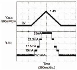 通過將背光調(diào)整到合適的水平,就可以顯著減少從電池吸收的功率。圖3顯示了一種使用情況,突出了在5個(gè)亮度區(qū)使用系統(tǒng)可能實(shí)現(xiàn)的電力節(jié)省:陽光、陰天室外、明亮的辦公室、昏暗的房間、夜間/電影院。亮度值分別設(shè)置為100%、85%、70%、60%和50%(25mA、21.3mA、17.5mA、15mA和12.5mA)。由于ALS的電壓上升(或通過傳感器增加環(huán)境光),在驅(qū)動(dòng)器迫使LED電流變化之前,驅(qū)動(dòng)IC在預(yù)定時(shí)間內(nèi)對(duì)ALS電壓采樣。規(guī)定(或平均)時(shí)間內(nèi)的ALS電壓采樣有助于防止在瞬息萬變的照明條件下出現(xiàn)LED閃爍。