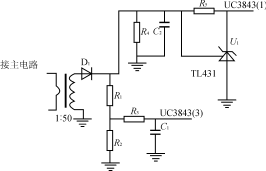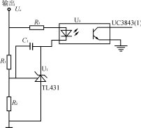 電壓反饋電路如圖3所示,輸出電壓通過集成穩壓器TL431和光耦反饋到UC3843(1)腳,調節R1、R2分壓比可設定和調節輸出電壓,達到較高的穩壓精度。如果輸出電壓Uo升高,集成穩壓器TL431陰極到陽極的電流增大,使光耦輸出三極管電流增大即UC3843(1)腳對地的分流變大,UC3843輸出脈寬相應變窄,輸出電壓Uo減小。同樣地,如果輸出電壓Uo減小,可通過反饋調節使之升高。