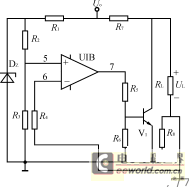 圖6為空載保護電路。為了防止變壓器繞組上電壓過高,同時也為了使電源從空載到滿載的負載效應較小,開關穩壓電源輸出端一般不允許開路。圖6中R2R3,給運放同相輸入端提供固定的小電壓U+。R8為取樣負載電流的分流器,當外電路未接負載RL時,R8上無電流,運放反相輸入端電壓U-=0,因而U+>U-,運放輸出電壓較高,使三極管V1飽和導通,將電源內部的假負載R7自動接入。當電源接入負載RL時,R8上的壓降使U->U+,運放輸出電壓為零,V1截止,將R7斷開。