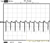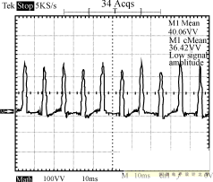 圖8~圖10為輸入電壓220V的條件下,輸出端的負載狀況分別為空載、半載和全載時,輸入端的功率波形圖。由這3個圖可以看出,輸入功率是個脈沖序列,周期為10ms,即每半個工頻周期電源輸入端通過整流橋為輸入平滑濾波電容充一次電。測量輸入功率時串聯于輸入端的采樣電阻為2.0Ω,因此功率為圖示值除以2。半載時輸出功率為:12.3662/10=15.29W,全載時輸出功率為:12.2552/5=30.04W。電路正常工作時,漏極電壓波形如圖11所示。