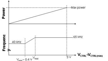 VCTRL與功率及頻率的關系:當輸出功率下降時,VCTRL隨之下降;當到達反走設定點時,頻率線性下降;65 kHz版本將最小頻率內部設定為40 kHz。